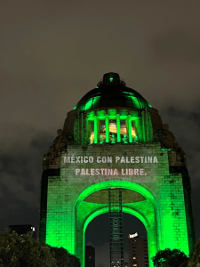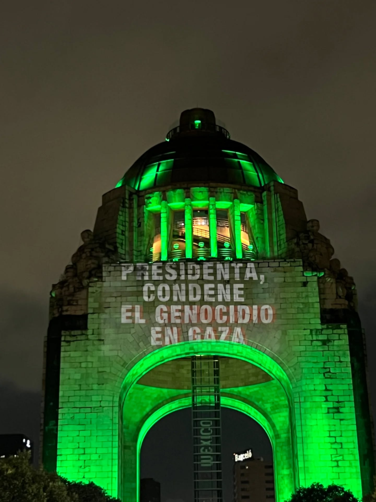 La proyección de los mensajes acompañó una carta abierta en la que los activistas demandan a la presidenta Claudia Sheinbaum que condene públicamente el genocidio por parte de Israel en la Franja de Gaza, que rompa relaciones diplomáticas con el gobierno israelí y que proteja a los integrantes de la delegación mexicana en la Flotilla Global Sumud, que se dirige a Palestina.