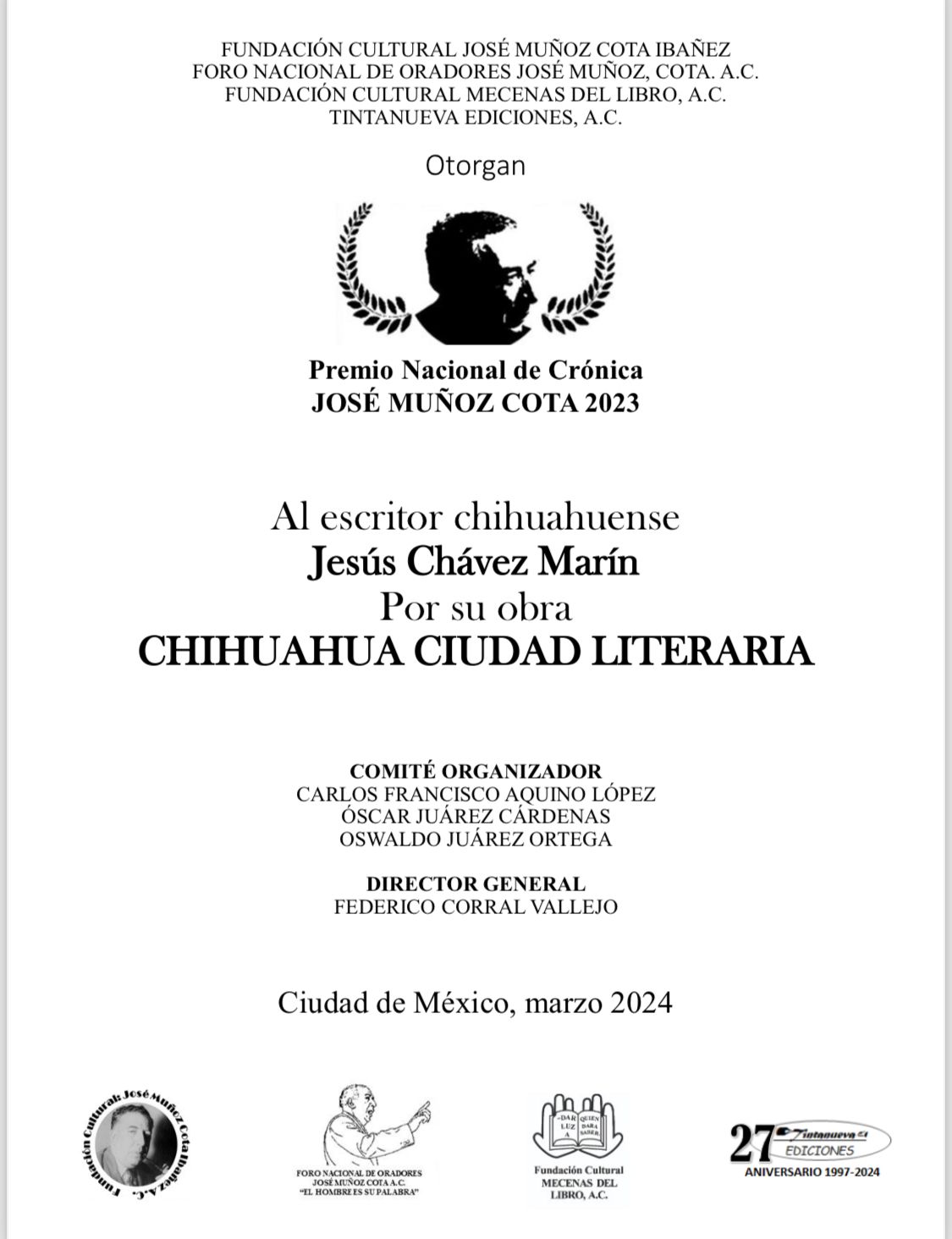 Otorgan premio nacional literario a escritor chihuahuense Jesús Chávez Marín